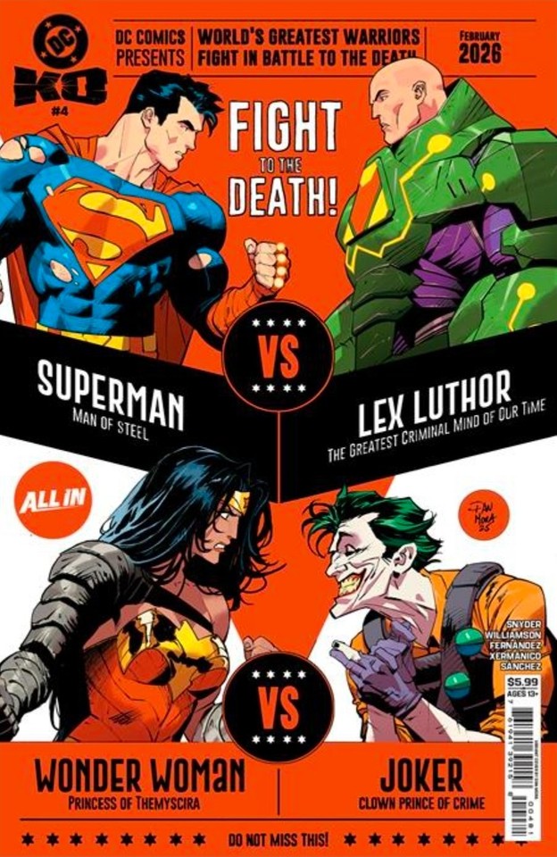 THE FINAL FOUR ARE PUT TO THE ABSOLUTE TEST! Three mysterious new Omega-charged fighters have entered the tournament...and this trinity of the Absolute will change the face of the DCU forever! It’s all down to how far the final four are willing to go to win in the penultimate chapter of DC K.O.! Plus: Booster’s true allegiance revealed, Darkseid’s return foretold, and a bonkers last page that will bring the battle to the next level!